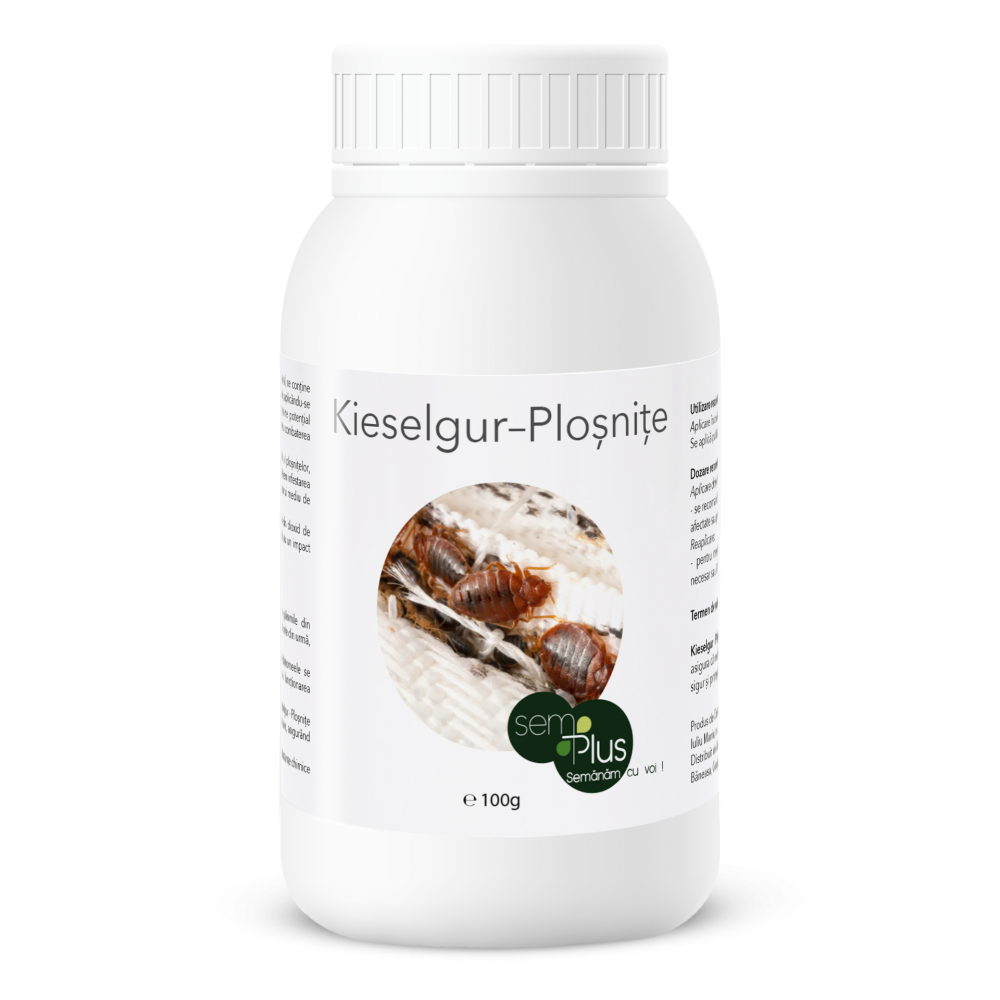 Kieselgur - Ploșnițe de Pat este un produs inovator, 100% natural, ce conține diatomee, cu o cantitate de 500g. Se utilizează prin împrăștiere, aplicându-se pulberea în crăpăturile mobilierului, ușilor, pardoselii și altor zone potențial infestate. Produsul oferă o soluție eficientă și ecologică pentru combaterea ploșnițelor de pat, având o perioadă de valabilitate nelimitată.