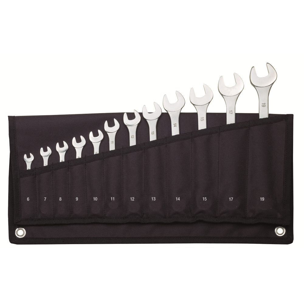 Setul contine cheile fixe: 6 – 7 – 8 – 9 – 10 – 11 – 12 – 13 – 14 – 15 – 17 si 19mm. Marimile cheilor sunt marcate cu laser, dimensiunile fiind clar vizibile.