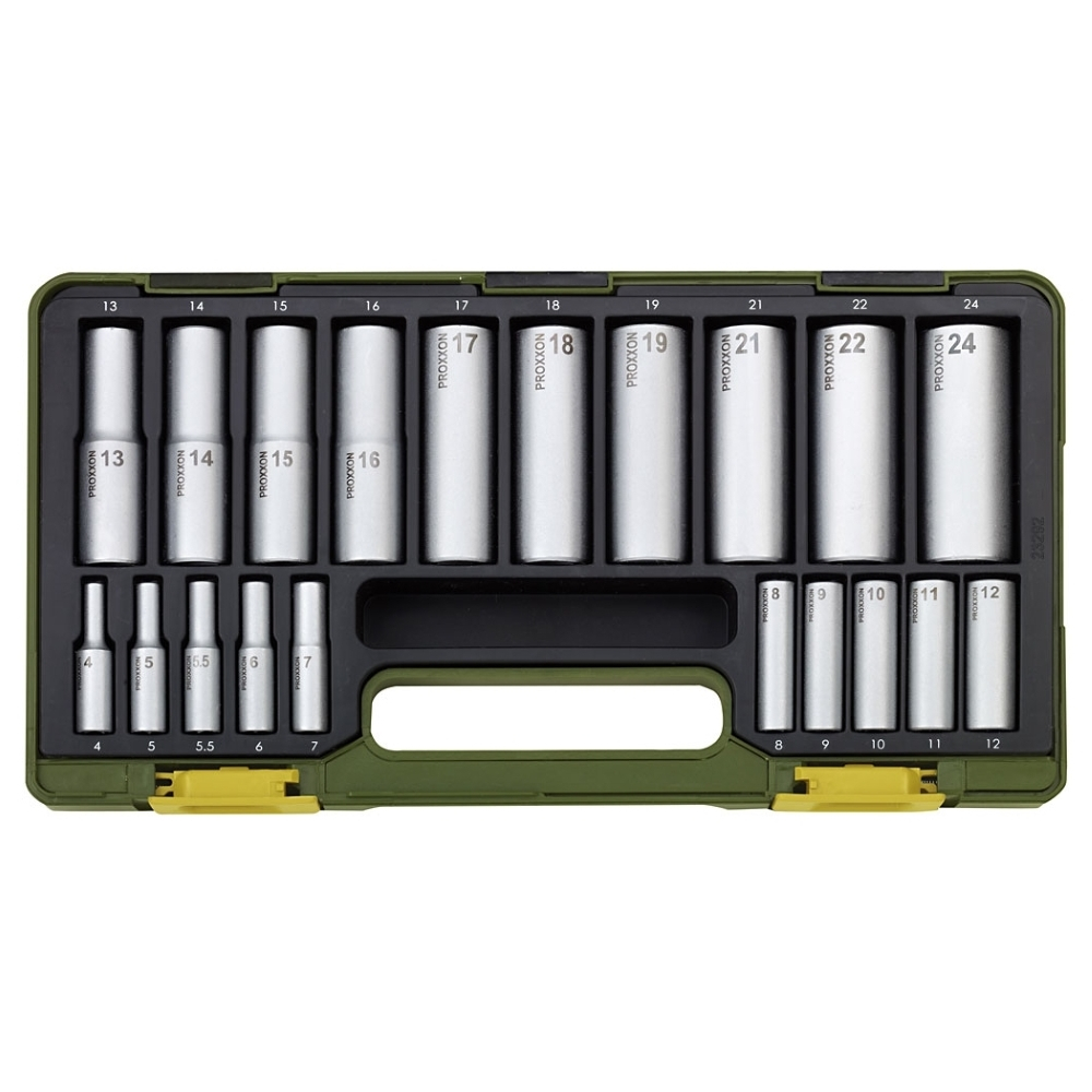 Cu patrat de antrenare de 1/4' pentru forte de strangere de pana la 25Nm: chei tubulare de 4-5-5.5-6-7-8-9-10-11 si 12mm.