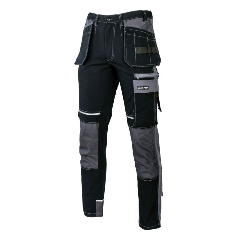 • Țesătură rezistentă și durabilă. 15 buzunare, dintre care 1 cu închidere prin fermoar. Buzunare funcționale și detașabile. Buzunar pentru telefon mobil. Componente reflectorizante. Cusături duble. Ajustarea inovativă a lățimii la talie folosind o construcție specială cu bandă elastică. Bandă suport ciocan/ruletă. Porțiuni întărite pe buzunare, genunchi și partea inferioară a pantalonilor dintr-un material rezistent la uzură (poliester 300D). Model dotat cu port ecuson.